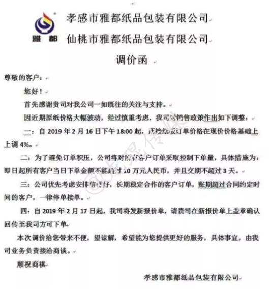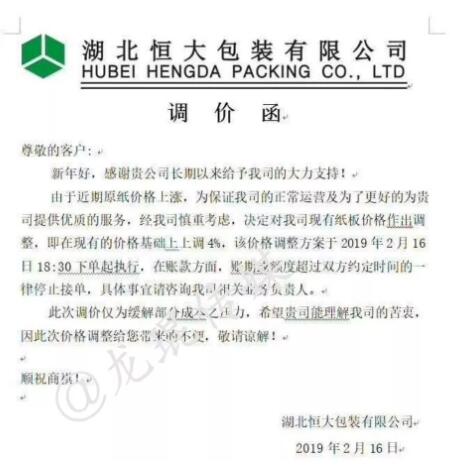 湖北恒大包裝有限公司 自2019年2月16日18:30起,在現(xiàn)有價格基礎(chǔ)上上調(diào)4%。在賬款方面,賬期或額度超過雙方約定時間的一律停止接單。