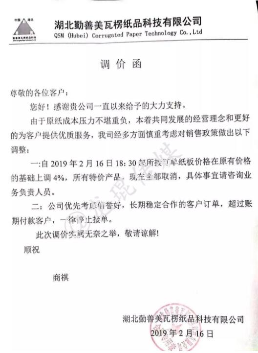 湖北勤善美瓦楞紙品科技有限公司 自2019年2月16日18:30起,紙板價格在原有價格基礎(chǔ)上上調(diào)4%。