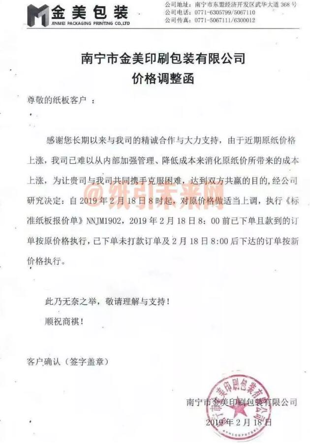 2月18日,南寧市金美印刷包裝有限公司發布漲價函: 2019年2月18日8時起,對原價格做適當上調,執行《標準紙板報價單》NNJM1902,2019年2月18日8:00前已下單且款到的訂單按原價格執行,已下單未打款訂單及2月18日8:00后下達的訂單按新價格執行。