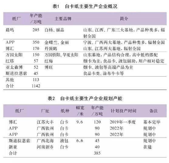 2019年2月白卡紙市場價格維持平盤,預計接下來推漲情況與需求面回暖息息相關。 短期來說,目前白卡紙價格接近歷史低位,考慮到成本因素,紙廠有意對白卡紙進行推漲,具體落實情況仍將受到需求面的影響。中長期來說,博匯紙業白卡紙新增產能計劃投產時間將近,生產商極大可能擴大出口以及部分轉產食品卡等特殊白卡,釋放產能壓力。同時,2019年富陽新區規劃,年底前如果產能有效騰退,白卡紙新增供給部分吸收替代淘汰白板紙產能,白卡紙價格或將維持弱平衡;否則白卡紙市場還將面臨產能過剩、價格承壓的風險。 一、白卡紙國內產能分析 1、現有產能 國內白卡紙行業主要產能1140余萬噸,其APP、晨鳴、博匯、太陽四大主流廠家合計產能約875萬噸,占比77%左右,且大型紙廠仍有新上產能的規劃,行業高度集中,寡頭特征明顯。詳見表1。 2、潛在產能 白卡紙作為高端包裝紙,需求相對較好,據了解近年來年均增速基本在5%~7%,細分品類里部分品種如食品卡增速或超過10%,因此各大紙廠為鞏固市場份額以及開發新的利潤增長點,紛紛新上項目。據了解國內目前規劃中的產能約385萬噸,其中江蘇博匯PM4(120萬噸)紙機安裝基本完畢,投產時間臨近,而其他紙廠大多處于規劃中。詳見表2。
