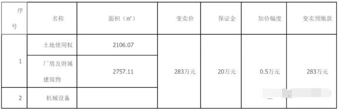 拍賣時間:2019年3月8日10時至2019年5月7日10止 評估價:352.91萬元 變賣價:283萬元 增加幅度:0.5萬元 聯系方式:方法官17755913591 拍賣標的 黃山市四方彩印包裝有限公司所有的坐落在安徽省休寧縣東臨溪鎮上村的房地產(包括附屬建筑)、機械設備。 土地使用權證號:休國用(2009)第0588號;產權證號為:房地權證休字第30114764號,房地權證休字第31112986號,房地權證休字第30111577號。
