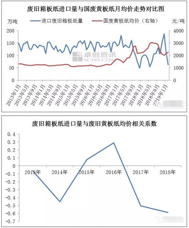 近年在固體廢物進(jìn)口管理制度改革背景下,國產(chǎn)廢紙價(jià)格與廢紙進(jìn)口量的關(guān)系日益緊密。由上圖可見,2017年以來,廢舊箱板紙進(jìn)口量和國廢黃板紙價(jià)格波動(dòng)的聯(lián)動(dòng)性增強(qiáng)。 究其原因,仍是固體廢物進(jìn)口政策改革以來,實(shí)際廢紙進(jìn)口量減少影響市場供需矛盾關(guān)系。 經(jīng)過計(jì)算,廢舊箱板紙進(jìn)口量與國廢黃板紙價(jià)格負(fù)相關(guān)性明顯加強(qiáng)。二者相關(guān)系數(shù)2016年為0.29,而2018年則為-0.59。 那么依據(jù)國務(wù)院制定的2020年年底前固體廢物進(jìn)口數(shù)量歸零的目標(biāo),后期廢紙進(jìn)口量減少勢在必行,對標(biāo)廢舊黃板紙的價(jià)格應(yīng)該上行才符合二者的負(fù)相關(guān)性,但是否國廢黃板紙價(jià)格會(huì)再次沖高?其實(shí)從基本面分析角度看,缺口能否繼續(xù)兌現(xiàn)為價(jià)格漲幅,更應(yīng)該關(guān)注其修復(fù)情況。 整合卓創(chuàng)資訊采集的基本面數(shù)據(jù),廢紙供應(yīng)缺口修復(fù)現(xiàn)況如下: 1、進(jìn)口箱板瓦楞紙數(shù)量高速增長