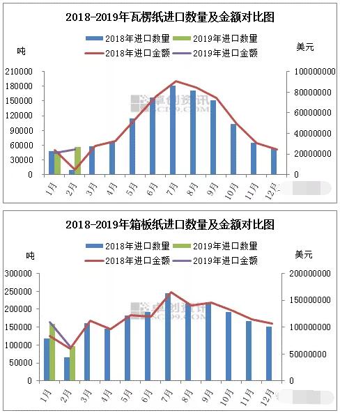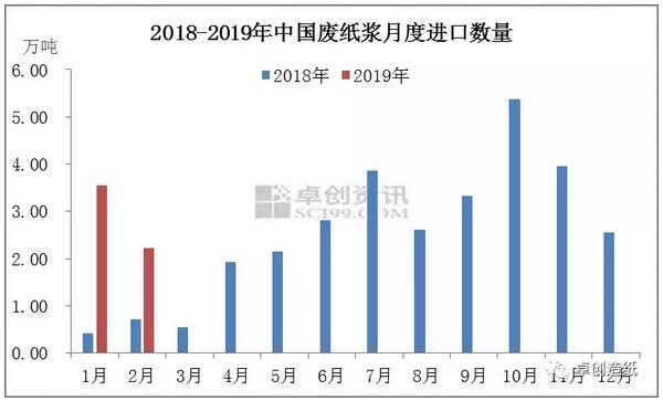 進(jìn)口成品紙數(shù)量同比大增。在2018年瓦楞紙、箱板紙進(jìn)口累計(jì)量同比分別增長61.49%、48.70%的基礎(chǔ)上,2019年1-2月瓦楞箱板紙進(jìn)口繼續(xù)大幅增長。據(jù)海關(guān)數(shù)據(jù)顯示,2019年1-2月箱板紙累計(jì)進(jìn)口量為25.66萬噸,同比增長39.99%;瓦楞紙累計(jì)進(jìn)口量為10.39萬噸,同比增長85.20%。 2、進(jìn)口廢紙漿數(shù)量暴增
