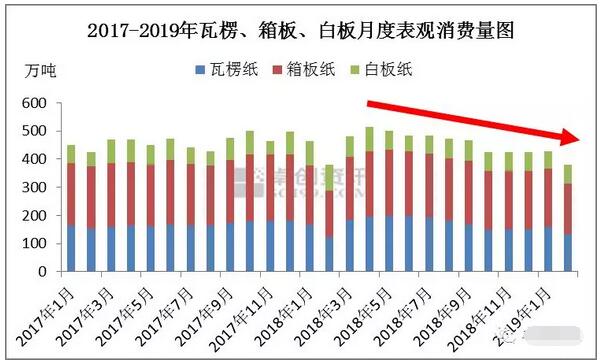 自2018年3月1日,進(jìn)口廢紙含雜率新標(biāo)準(zhǔn)實(shí)施以來,廢紙漿進(jìn)口量進(jìn)入高速增長通道。2018年廢紙漿累計(jì)進(jìn)口量達(dá)30.26萬噸。據(jù)海關(guān)數(shù)據(jù)顯示,2019年1-2月廢紙漿累計(jì)進(jìn)口5.76萬噸,同比增長414%。 3、瓦楞箱板紙、白板紙表觀消費(fèi)量逐月下滑