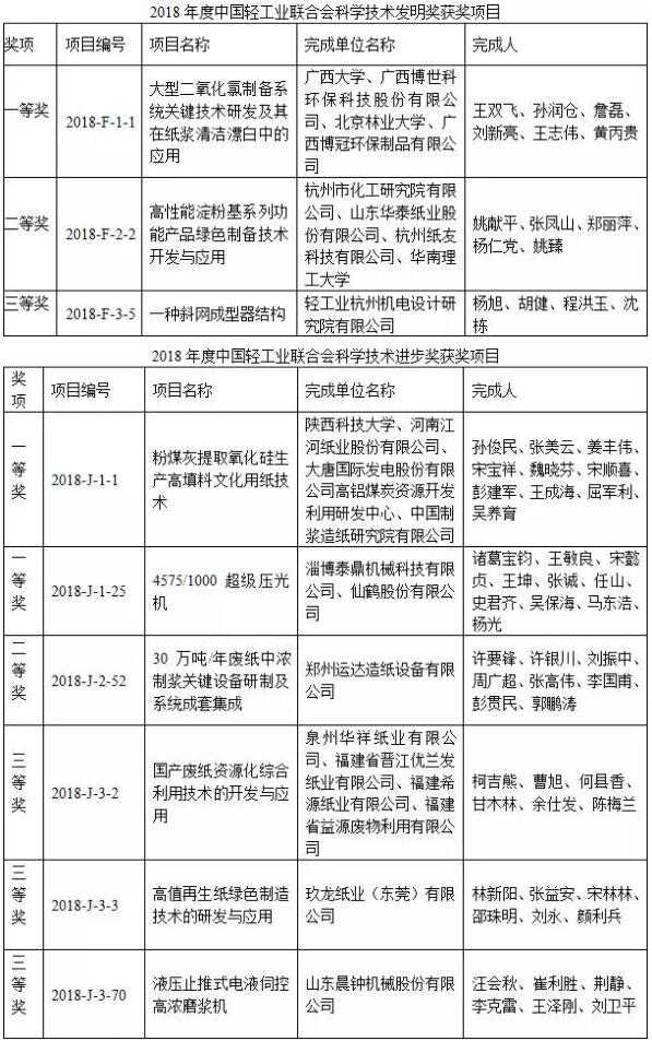 2019年3月25日,中國輕工業(yè)聯(lián)合會發(fā)布《關(guān)于2018年度中國輕工業(yè)聯(lián)合會科學(xué)技術(shù)獎勵的決定》。根據(jù)《中國輕工業(yè)聯(lián)合會科學(xué)技術(shù)獎勵辦法》的規(guī)定,經(jīng)中國輕工業(yè)聯(lián)合會科學(xué)技術(shù)獎勵專業(yè)組評審、中國輕工業(yè)聯(lián)合會科學(xué)技術(shù)獎勵委員會審核,中國輕工業(yè)聯(lián)合會批準(zhǔn),2018年度中國輕工業(yè)聯(lián)合會授獎項目共182項。其中3項造紙成果榮獲科學(xué)技術(shù)發(fā)明獎,6項造紙成果榮獲科學(xué)技術(shù)進(jìn)步獎。