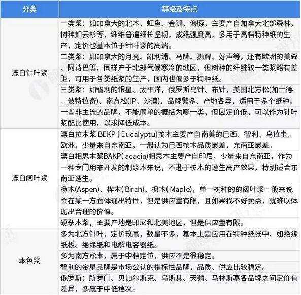 針葉漿是指由針葉樹作為原材料制成的木漿,如馬尾松、落葉松、紅松、云杉等,針葉樹多生長于中高緯度地區如北美、北歐、俄羅斯、智利等地區和國家,對應品牌種類也較多;闊葉漿是指由闊葉樹作為纖維原料制成的木漿,如樺木、楊木、椴木、桉木、楓木等,闊葉樹多生長于中低緯度地區,如美國南部、巴西、智利和印度尼西亞等地區,品牌種類也較多。此外,漂白化學機械漿主要產自加拿大、中國等。 圖表2:全球主要紙漿品牌分布情況