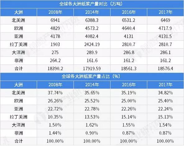 全球紙漿產業遷移路徑分析 《2018年全球紙業發展報告》暫未公布,為保證數據統計口徑一致,使得產業路徑對比更具有效性,本節僅選取2008年、2014年和2017年三個時間節點對全球紙漿產業相關情況進行對比,從而探究全球紙漿產業的遷移路徑。 全球紙漿產業向拉丁美洲遷移 通過對比四個年度全球紙漿(不包含廢紙漿)產量的區域分布情況發現,受資源限制,各大洲的紙漿產量份額變動不大;北美洲和非洲的紙漿產量份額小幅下降,拉丁美洲的紙漿產量增長相對較快,市場份額從2008年的10.35%上升至15.13%。綜上,全球紙漿產業向拉丁美洲轉移。 從2016-2017年的數據來看,全球紙漿產業的生產格局基本保持穩定;其中,北美洲占全球比重在35%上下浮動,歐洲比重約25%,亞洲約22%,拉丁美洲約15%,大洋洲約2%,非洲約15。 圖表5:歷年全球各大洲紙漿產量對比(單位:萬噸,%)