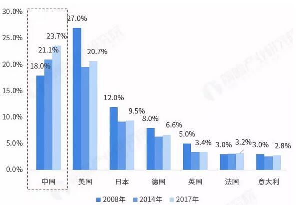 中國的廢紙回收量全球第一,廢紙漿利用程度最高 目前,各國直接進口廢紙漿的貿易量很少,而是選擇進口廢紙后再在國內制成廢紙漿。因此,通過對比歷年各國廢紙回收利用情況來考察全球廢紙漿的競爭格局和遷移路徑。 據統計,2008年全球廢紙回收量1.9億噸;2017年全球廢紙回收量2.3億噸,全球廢紙回收量整體呈上升趨勢,廢紙回收利用制成廢紙漿已經成為環保、節省成本大趨勢。對比主要國家的廢紙回收量占比情況發現,美日德等國家的廢紙回收量占比都呈下降趨勢,中國的廢紙回收量全球第一,已經超過了美國。綜上,中國的廢紙回收量最大,廢紙漿利用程度最高。 圖表7:全球主要國家的廢紙回收量占全球比重的變化情況(單位:%)