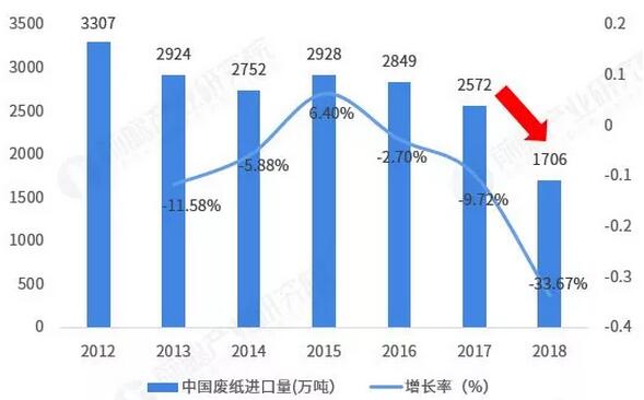 中國紙漿行業發展現狀分析 《國民經濟分類》中將紙漿制造分成兩大類:木竹漿和非木竹漿(廢紙漿屬于木竹漿),但綜合考慮到目前中國的廢紙漿在造紙中應用比重超過60%,竹漿比重較小。故本節的分析將紙漿分為三類,即木漿、廢紙漿和非木漿。 廢紙漿上游:廢紙回收困難重重,2018年回收量大幅下降 據海關總署統計,2018年,中國共進口各類廢紙1705.5萬噸,遠低于2017年的2572萬噸,同比減少約33.8%,降幅創近年來之最,與2012年相比,國內進口廢紙量已經下跌近一半。 圖表8:2012-2018年中國進口廢紙量及其變化情況(單位:萬噸,%)