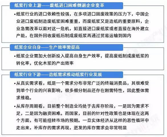 紙漿行業發展趨勢 從上游的供給看,廢紙漿對進口市場的依賴性較強,而進口固體廢物的相關政策限制,企業可獲得廢紙進口配額受限,企業需開拓資源直接進口廢紙漿,或者去國外投資布局——在國外回收廢紙后直接在國外生產為廢紙漿再通過貿易運輸到國內。 從行業自身看,紙漿企業需加大創新投入提高自身生產效率,提高廢紙制成廢紙漿的轉化率,優化木漿的產出效率。 從下游行業造紙的需求看,2019年紙漿行業的需求有望回升,主要是來自兩個方面,真實需求的穩定增長和庫存周期的變動;無論是紙的需求提高推動紙漿行業發展,還是企業補庫存需求,2019年紙漿行業的需求都有望回升。 綜上,國內紙漿行業面臨重重挑戰,下游需求有望回升的背景下,上游的進口渠道又受限,企業只有加大創新投入,提高廢紙漿和木漿的生產效率才是根本的解決之道。 圖表15:中國紙漿產業發展趨勢