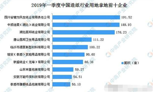 據(jù)榜單顯示,進入榜單前十企業(yè)分別為:四川省犍為鳳生紙業(yè)有限責任公司、中順潔柔(湖北)紙業(yè)有限公司、湖北麗邦紙業(yè)有限公司、唐山恩邦衛(wèi)生用品有限公司、臨沂市源夏新型材料有限公司、恒安(孝感)家庭用品有限公司、聯(lián)盛紙業(yè)(龍海)有限公司、山東豐基包裝有限公司、安徽萬能環(huán)保科技有限公司、孝感市雅都紙品包裝有限公司。其中,四川省犍為鳳生紙業(yè)有限責任公司2019年一季度用地拿地面積最多,達191.52畝。