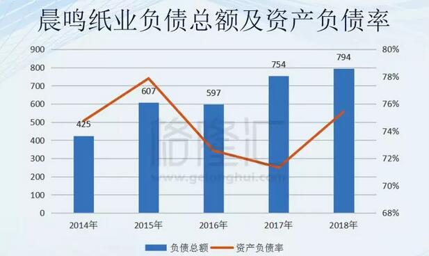 2017年由于供給側(cè)改革以及環(huán)保政策的實施,很多中小型企業(yè)被關(guān)閉,供給端的減少導(dǎo)致紙價的上漲。在2018年年初,上海地區(qū)博匯250g的白卡紙一度突破7500元/噸。但是在2018年以后,市場對機(jī)制紙的需求并沒有增加,疊加貿(mào)易戰(zhàn)等因素的影響,下跌成為了2018年紙價的主旋律。 2018年一季度,上海地區(qū)博匯250g的白卡紙市場價平均為6960元/噸,而2019年一季度,市場價平均為5050元/噸,同比下跌接近30%。 紙價的下跌也在晨鳴紙業(yè)的機(jī)制紙業(yè)務(wù)中得到了體現(xiàn),2018年、2017年晨鳴紙業(yè)機(jī)制紙營收分別為178.5億元、186.2億元,2018年同比下降5%;2018年、2017年晨鳴紙業(yè)機(jī)制紙營業(yè)利潤分別為64.54億元、76.6億元,2018年同比下降20%。2019年一季度紙價比2018年整年平均低得多,所以機(jī)制紙業(yè)務(wù)同比下降幅度也會更大。 2、債務(wù)纏身 造紙作為傳統(tǒng)的制造業(yè),且具有極強(qiáng)的周期性,或許是不滿足于造紙的低毛利率,晨鳴紙業(yè)2014年開始進(jìn)軍金融行業(yè)。 2014年,為了拓展租賃業(yè)務(wù)范圍,加大金融板塊投入,培育新的利潤增長點,晨鳴紙業(yè)在濟(jì)南成立了全資子公司——山東晨鳴租賃,注冊資本達(dá)77億元。 2017年,租賃版圖擴(kuò)展至上海,上海晨鳴租賃有限公司成立,注冊資本10億元。 2018年,租賃版圖進(jìn)一步擴(kuò)張。晨鳴紙業(yè)在武漢和北京兩地成立融資租賃全資子公司。 租賃業(yè)務(wù)為晨鳴紙業(yè)帶來頗豐的收入與利潤。由上面介紹可知,晨鳴紙業(yè)2018年融資租賃業(yè)務(wù)營收22.02億元,只占總營收8%,營業(yè)利潤20.34億元,占比高達(dá)23%,毛利率高達(dá)92.38%,遠(yuǎn)高于機(jī)制紙業(yè)務(wù)26.55%。 但是融資租賃業(yè)務(wù)卻會給晨鳴紙業(yè)帶來巨大的引誘,那就是高負(fù)債。 晨鳴紙業(yè)對資金非常饑渴,只能通過大舉外債來維持運營。根據(jù)2018年的年報顯示,晨鳴紙業(yè)2018年、2017年兩年間總共發(fā)行了24期超短期融資券,總共募集資金203億元。 晨鳴紙業(yè)負(fù)債總額從2014年425億元增長至2018年794億元,2018年資產(chǎn)負(fù)債率高達(dá)75%,遠(yuǎn)遠(yuǎn)高于同是山東的造紙龍頭太陽紙業(yè)57%。除此之外,晨鳴紙業(yè)還有45億元的優(yōu)先股和30億元的永續(xù)債歸屬于所有者權(quán)益,這也對將來晨鳴紙業(yè)的利潤打折扣。