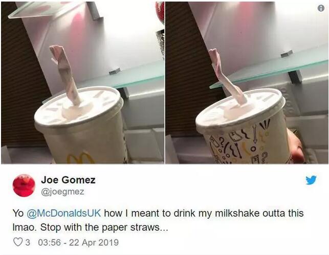 據英國《太陽報》4月23日報道,為替代塑料吸管,麥當勞于去年9月開始在英國和愛爾蘭的門店推廣的新型環保紙質吸管引起了一部分消費者的抵制。因為在喝奶昔的時候,這種環保紙質吸管會“溶解”在里面,這引起了消費者的不滿。現在已經有三萬人簽署了請愿書,要求換回塑料吸管。 出于對塑料污染的擔憂,麥當勞從去年9月開始在英國和愛爾蘭的1361家門店推廣新型的環保紙吸管,這種新吸管的材料是來自已認證的可回收紙張。本來麥當勞預計這種新型環保紙吸管在英國和愛爾蘭的初步推廣會在今年全面完成,但是現在,由于這種紙吸管的使用感并不理想,導致很多顧客在推特上痛罵麥當勞。甚至有些人威脅要抵制麥當勞,直到它把塑料吸管換回來。