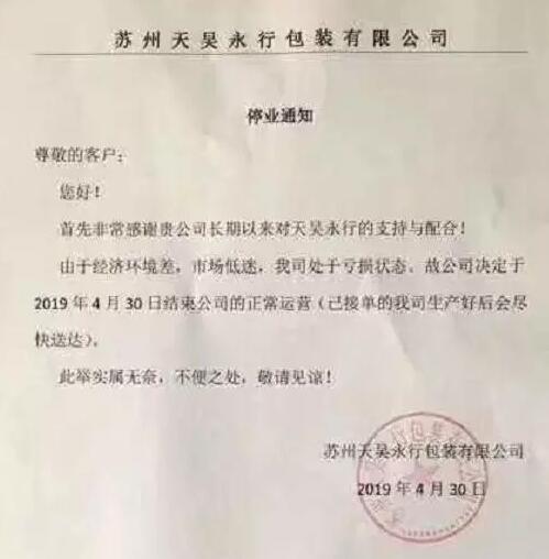 行情不好,生意難做。在4月份的最后一天,江蘇省蘇州市某包裝公司發(fā)布停業(yè)通知稱,由于經(jīng)濟(jì)環(huán)境差,市場低迷,公司處于虧損狀態(tài),只好結(jié)束正常運(yùn)營。