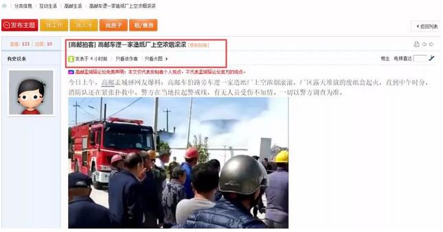 5月4日上午,江蘇省高郵市盂城驛網友爆料:高郵車伯路旁車邏一家造紙廠上空濃煙滾滾,廠區露天堆放的廢紙盒起火。直到當天中午,消防隊還在緊張撲救中。