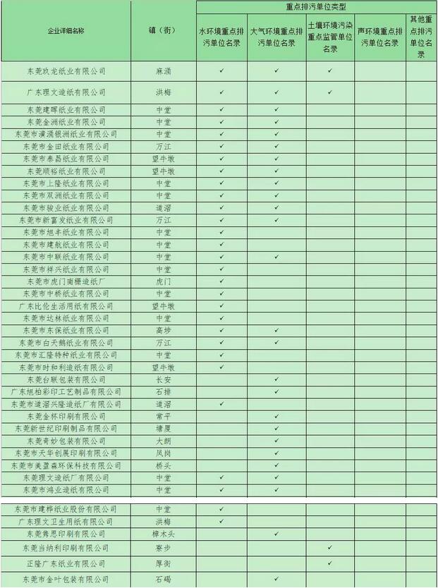 每年根據實情動態更新 據了解,東莞從2015年起,按照國家、省有關要求,每年組織制定《重點排污單位名錄》,并主動公開發布,今年已是第五年,每年都會根據實際情況進行動態更新。 《名錄》中的重點排污單位主要分為四種類型,一是水環境重點排污單位,二是大氣環境重點排污單位,三是土壤環境污染重點監管單位,四是聲環境重點排污單位。被列入《名錄》的40家業內企業中,不少企業被列入多個類型。 上榜單位應公開環保信息 據相關規定,上榜的重點排污單位,應該在6月底前主動公開環境信息,包括:基礎信息、排污信息、防治污染設施的建設和運行情況、建設項目環境影響評價及其他環境保護行政許可情況、突發環境事件應急預案、其他應當公開的環境信息。 若發現內容不真實、弄虛作假等行為,由市生態環境部門依法處罰。若拒不改正違法行為的,將根據《廣東省環境保護條例》七十九條規定實施按日連續處罰。 兩類單位須裝監控裝置 當前,東莞市正著力推進治水攻堅戰、藍天保衛戰,涉及大氣、水環境重點排污單位,按要求需在今年9月底前完成自動監控設備安裝聯網工作: 大氣環境重點排污廢氣監控點應當監控顆粒物、二氧化硫、氮氧化物三項污染物以及煙氣含氧量、流速、流量、溫度、濕度五項煙氣參數; 水環境重點排污單位廢水監控點應當監控化學需氧量、氨氮兩項污染物以及廢水流量、pH兩項參數;氮磷重點排放行業的企業還應當監控總氮、總磷兩項污染物。 10月后,東莞市生態環境部門將進行核查,沒有安裝自動監控裝置、或不整改的重點排污單位將面臨處罰。 業內上榜的40家企業名單 業內上榜的40家企業全部集中于水環境重點排污單位、大氣環境重點排污單位、土壤環境污染重點監管單位三種類型,有的企業環保壓力較大,如東莞玖龍、廣東理文,三種類型均將其涵蓋其中。 1、土壤環境污染重點監管單位名錄 東莞玖龍紙業有限公司 廣東理文造紙有限公司 東莞當納利印刷有限公司 正隆廣東紙業有限公司 2、水環境重點排污單位名錄 東莞玖龍紙業有限公司 廣東理文造紙有限公司 東莞建暉紙業有限公司 東莞金洲紙業有限公司 東莞市潢涌銀洲紙業有限公司 東莞市金田紙業有限公司 東莞市泰昌紙業有限公司 東莞順裕紙業有限公司 東莞市上隆紙業有限公司 東莞市雙洲紙業有限公司 東莞市駿業紙業有限公司 東莞市新富發紙業有限公司 東莞市旭豐紙業有限公司 東莞市建航紙業有限公司 東莞市中聯紙業有限公司 東莞市祥興紙業有限公司 東莞市虎門南柵造紙廠 東莞市中橋紙業有限公司 廣東比倫生活用紙有限公司 東莞市達林紙業有限公司 東莞市東保紙業有限公司 東莞市白天鵝紙業有限公司 東莞市匯隆特種紙業有限公司 東莞市時和利造紙有限公司 東莞市道滘興隆造紙廠有限公司 東莞理文造紙廠有限公司 東莞市鴻業造紙有限公司 東莞市建樺紙業股份有限公司 廣東理文衛生用紙有限公司 3、大氣環境重點排污單位名錄 東莞玖龍紙業有限公司 廣東理文造紙有限公司 東莞建暉紙業有限公司 東莞金洲紙業有限公司 東莞市潢涌銀洲紙業有限公司 東莞市金田紙業有限公司 東莞市泰昌紙業有限公司 東莞順裕紙業有限公司 東莞市上隆紙業有限公司 東莞市雙洲紙業有限公司 東莞市駿業紙業有限公司 東莞市新富發紙業有限公司 東莞市中聯紙業有限公司 東莞市東保紙業有限公司 東莞市白天鵝紙業有限公司 東莞臺聯包裝有限公司 廣東旭柏彩印工藝制品有限公司 東莞金杯印刷有限公司 東莞新世紀印刷制品有限公司 東莞奇妙包裝有限公司 東莞市天華創展印刷有限公司 東莞市美盈森環保科技有限公司 東莞理文造紙廠有限公司 東莞市鴻業造紙有限公司 東莞雋思印刷有限公司 東莞市金葉包裝有限公司