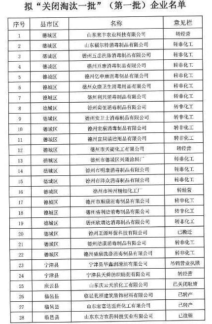濱州擬“關閉淘汰一批”(第一批)化工生產企業名單