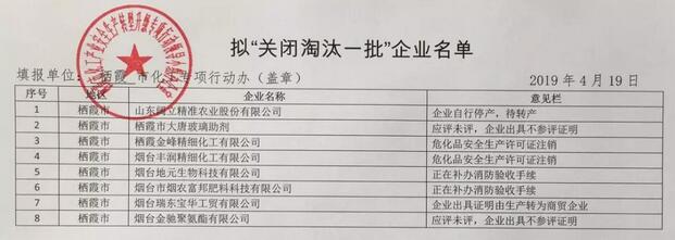 棲霞擬“關閉淘汰一批”(第一批)化工生產企業名單