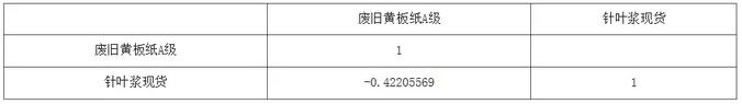 由表可見,2018年11月27以來,針葉漿現(xiàn)貨價(jià)格與廢舊黃板紙A級現(xiàn)貨日均價(jià)相關(guān)系數(shù)為-0.42,二者之間呈現(xiàn)較強(qiáng)的負(fù)相關(guān)性,與二者之間存在的單向替代關(guān)系背離。