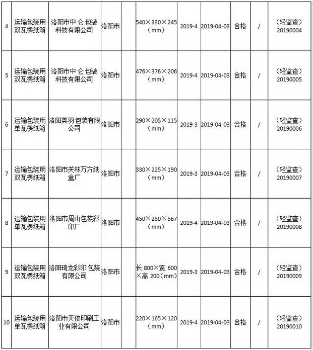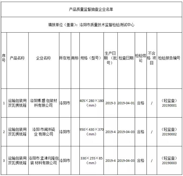 近日,洛陽市市場監督管理局發布抽查公告稱,洛陽市質量技術監督檢驗測試中心于2019年第1季度,對全市范圍內運輸包裝用瓦楞紙箱生產企業進行市監督檢查。