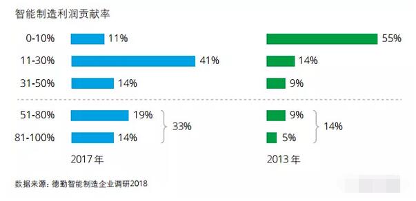 ▲ 受訪企業所處階段(基于企業自我評估) 智能制造利潤貢獻顯著提升向工業4.0進階為制造企業帶來真實可見的效益。2013年德勤曾調研全國200家制造型企業,結果顯示中國企業智能制 造處在初級階段,且利潤微薄。經過五年的快速發展,智能制造產品和服務的盈利能力顯著提升。 2013年智能制造為企業帶來的利潤并不明顯,55%的受訪企業其智能制造產品和服務凈利潤貢獻率處于0-10%的區間,而2017年,僅有11%的受訪企業處于這個區間,而41%的企業其智能制造利潤貢獻率在11-30%之間。利潤貢獻率超過50%的企業,由2013年受訪企業占比14%提升到2017年的33%。智能制造利潤貢獻率明顯提升,利潤來源包括生產過程中效率的提升和產品服務價值的提升。