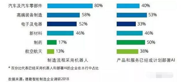 ▲ 受訪企業尚未部署人工智能的主要原因 人工智能正迅速滲透各行各業。汽車及汽車零部件制造、高端裝備制造、電子及電器制造三個行業在制造流程中采用機器人的比例過半。汽車及零部件制造行業使用機器人的企業比例達到80%,預示未來工業機器人的市場增量將主要來自非汽車行業。在產品和服務領域已 經或計劃部署人工智能的行業分布比較均勻,高端裝備制造和制藥比例較高,但其他行業如新材料、汽車及零部件、航空航天、電子及電器也正在或計劃部署人工智能。
