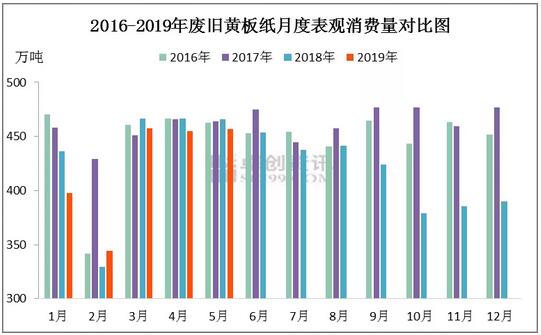 實際上,自步入2019年以來,紙價和廢紙價格就失去了昔日高高在上的姿態(tài),“炒房不如炒紙”的言論也逐漸消散,無論是上市紙廠還是中小紙廠,無論是紙企上游的打包站還是下游的包裝企業(yè),都面臨著需求寡淡、訂單下滑的窘境。 以廢紙價格為例。2019年1-5月份,廢紙價格先揚后抑,從2500元/噸以上的價位跌落至2000元/噸上下,其中的原因主要是受需求壓力所致。 一方面,廢紙消費量同比下降。2016年以來,對比春節(jié)后3月-5月廢紙月度表觀消費量來看,2019年數(shù)據(jù)有明顯下滑。據(jù)卓創(chuàng)資訊統(tǒng)計數(shù)據(jù)顯示,2019年3-5月,廢紙總消費量同比下降2.10%。