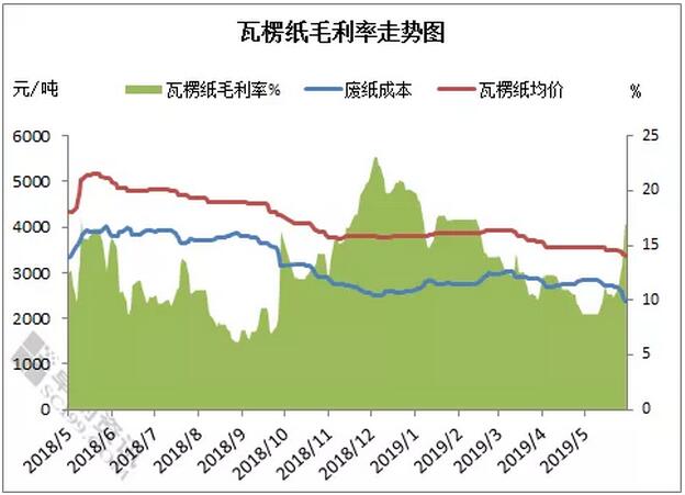 在以上背景下,成品紙利潤持續(xù)下移。2019年3月份以來,國內(nèi)瓦楞紙毛利率運行區(qū)間為7%-12%之間,紙廠生產(chǎn)經(jīng)營壓力較大,國內(nèi)包裝用紙企業(yè)生產(chǎn)步入困境。這也是玖龍紙業(yè)認為下半年紙價難言樂觀的直接原因。