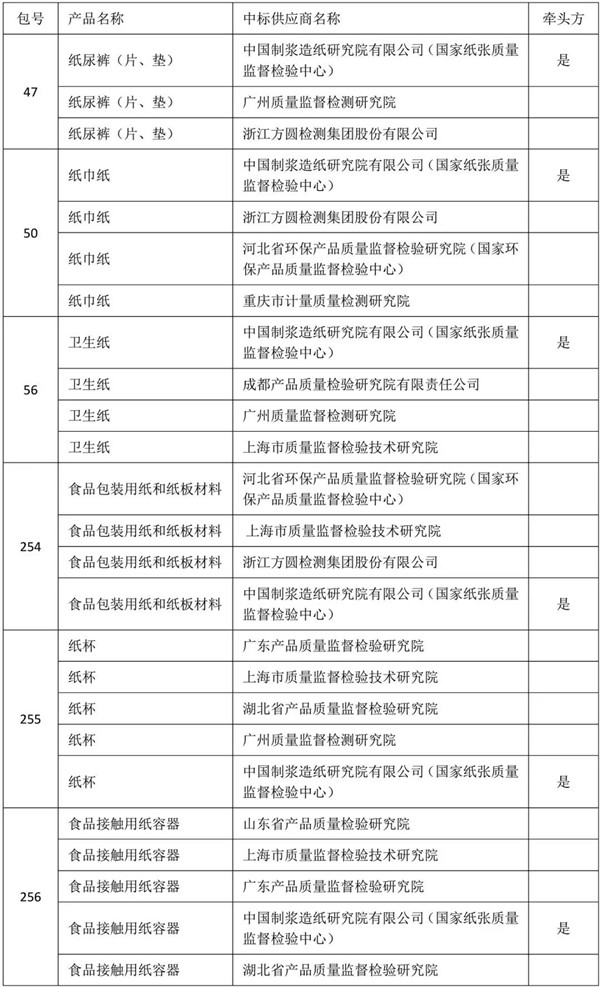 紙尿褲(片、墊)、紙巾紙、衛生紙、食品包裝用紙和紙板材料、紙杯、食品接觸用紙容器六大類造紙相關產品均由中國制漿造紙研究院有限公司牽頭多家單位承擔。以上造紙產品相關的中標單位及名稱詳見下表: