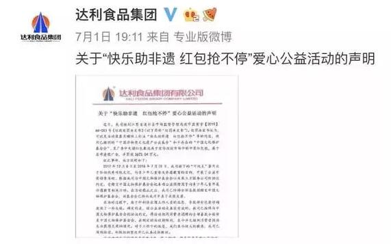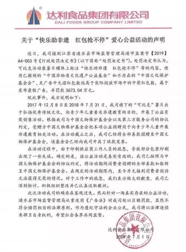 是公益活動還是一場騙局? 達利集團涉嫌虛假廣告宣傳 “快樂助非遺,紅包搶不!薄T2017年12月8日至2018年7月31日,達利集團可比克活動裝薯片開展了一次公益捐贈行動,上述10個字的助力非遺行動的口號即標注在罐體上,該活動內容介紹也很詳細:活動期間,凡購買可比克活動裝薯片,開蓋掃描封口內二維碼,即有機會獲得微信紅包1個或電子獎券,并可參與助力非遺公益活動及集卡活動,獲取其他禮品。消費者掃碼獲得現金紅包后,可選擇提現或助達利食品集團進行捐贈,還可點亮文化遺產項目來參與宣傳、傳播活動。消費者選擇助達利食品集團進行捐助的金額,將由達利食品集團全部捐贈給中國文化保護基金會,用于面向青少年開展非遺教育相關活動。該活動時間是“即日起至2018年7月31日”。 另外一款來自可比克黃色罐裝的薯片包裝殼上的文字則宣稱:達利食品集團將聯合中國非物質文化遺產公益基金發起“快樂助非遺,紅包搶不!惫嫘袆樱摶顒訒r間是“即日起至2018年5月31日”。 可以注意到,達利集團文中宣稱的聯合活動方包括“中國非物質文化遺產公益基金”和“中國文化保護基金會”。 本以為活動到期結束,產品將下架,但在之后根據江蘇省漣水縣市場監督管理局之后開展的調查中,上述活動過期后卻依然宣傳,執法人員在市場上還發現生產日期為“2018年8月6日”的可比克活罐裝薯片,其罐身依然是助力非遺活動宣傳的包裝。 漣水縣市場監督管理局經過前期8個多月輾轉多地深入調查,“中國文化保護基金會”根本不存在,而另一個“中國非物質文化遺產公益基金”早在2011年下半年就撤銷了。對此,漣水縣市場監督管理局認定達利集團存在以已撤銷的“中國非物質文化遺產公益基金”、不存在的“中國文化保護基金會”和實際紅包數遠低于允諾的紅包數發布虛假廣告。 對此,中華社會文化發展基金會在2018年11月5日也給漣水縣市場監督管理局出具“情況說明”并同時澄清:從未與達利食品集團進行過任何合作。 除上述虛假宣傳外,漣水縣市場監督管理局還發現,達利集團廣告宣傳的中獎紅包和紅包中獎率同樣涉嫌虛假廣告宣傳。 在活動裝薯片的罐身上,關于獎項設置非常明確地寫著:本次中獎紅包總數量為1.45億個,紅包中獎率為36%,獎項共設置7種,一等獎2888個,獎金1888元;二等獎1.888萬個,獎金108元…… 按36%的中獎率和紅包總數1.45億個計算,活動期間產品市場投放的總量應該超過4億個可比克薯片罐體。但是,據漣水縣市場監督管理局調查統計,達利食品集團投放在市場的活動產品總數僅9000多萬個(罐)。 對此,漣水縣市場監督管理局認為:實際的紅包數量遠低于允諾的紅包數量,而且廣告宣傳的2個公益組織目前均不存在,這屬于虛假廣告,嚴重違反了《中華人民共和國廣告法》相關規定。 依據《中華人民共和國廣告法》第四條規定:廣告不得含有虛假或者引人誤解的內容,不得欺騙、誤導消費者。廣告主應當對廣告內容的真實性負責。第二十八條規定:廣告以虛假或者引人誤解的內容欺騙、誤導消費者的,構成虛假廣告。廣告有下列情形之一的,為虛假廣告,其中第(二)項:商品的性能、功能、產地、用途、質量、規格、成分、價格、生產者、有效期限、銷售狀況、曾獲榮譽等信息,或者服務的內容、提供者、形式、質量、價格、銷售狀況、曾獲榮譽等信息,以及與商品或者服務有關的允諾等信息與實際情況不符,對購買行為有實質性影響的。 6月17日,漣水縣市場監管局下達行政處罰決定書,決定對達利食品集團處以3673.04萬元罰款,上繳國庫。 達利不認罰:將以法律途徑捍衛自身權利 達利集團進行的到底是公益活動還是一場騙局?達利集團方面是否有針對進行善款的捐贈? 對此,在7月1日每日經濟新聞(微信號:nbdnews)記者收到的達利集團方面的官方回復中,達利集團指出,“公益活動真實有效”“在活動結束后,已經將全部善款捐贈到中國文物保護基金會! 對此,記者登錄中國文物(達利的活動表述中為“文化”)保護基金會官網瀏覽后發現,達利集團方面的確在2018年8月1日以“快樂助非遺”項目的名義向中國文物保護基金會捐贈10萬元。 這也意味著達利集團真正捐到的是“中國文物保護基金會”,而罐身上宣傳的是“中國文化保護基金會”,一字之差背后被開出天價罰單,達利對于這樣的紕漏如何解釋? 在達利的官方回應中顯示,“在活動過程中,由于印刷供應商工作人員的疏忽,導致包裝印刷出現了一些失誤。但此次公益銷售活動是真實有效的。我司已完全、如期地履行協議約定,不存在任何虛假行為,受贈方中國文物保護基金會也按時拿到了善款。” 達利集團還指出,“在規定的活動期限內,至今并無接到消費者投訴無法獲得兌獎的情況! “詐捐門”背后有無烏龍? 對于工作中的疏忽,達利集團一方面在表示已深刻檢討、積極組織整改并已認真汲取教訓的同時,達利集團對于這份巨額罰單還存有異議。 “此次活動我司的確存在客觀過失。然而,針對一場真實存在的公益活動,漣水縣市場監督管理局從重適用《廣告法》對我司處以巨額罰款,顯然不符合錯罰相當的法律原則。”達利集團表示,“我們將尋求以法律途徑來捍衛自身權利! “看起來是一場由于供應商工作人員犯下的低級錯誤,但這么一場大型的活動,達利方面就沒有專業的市場人士進行審核?而且這么