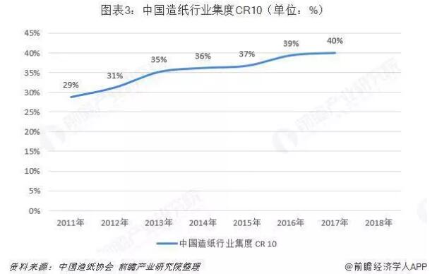 從行業(yè)整體的產(chǎn)銷量數(shù)據(jù)來看,經(jīng)過2010年以來的環(huán)保政策去產(chǎn)能之后,造紙行業(yè)的CR10從2011年的28.70%逐步上升到2017年的39.95%,而美國造紙行業(yè)在經(jīng)歷環(huán)保立法去產(chǎn)能及行業(yè)并購之后,CR10已經(jīng)達(dá)到了90%左右。