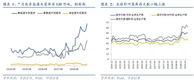 截至8月9日,針葉漿外盤平均價格為609美元/噸,折合人民幣4270元,環比上漲0.62%,同比下跌29.7%;內盤平均價格為4575元/噸,環比下跌2.22%,同比下跌13.9%;國內外價差縮減到305.5元/噸,環比下降40.5%,同比下降59.9%。 截至8月9日,闊葉漿外盤平均價格為531美元/噸,折合人民幣3727元,環比下跌8.4%,同比下跌32%;;內盤平均價格為3936元/噸,環比下跌5.5%,同比下跌34.6%;自7月5日起,闊葉漿恢復國內價格高于國際價格,國內外價差呈現出先擴大后縮小的態勢,7月25日達到最高的371.7元/噸。 18年8月以來內盤漿價調整明顯,先于外盤漿價下跌,去年10月以來隨著國內貿易商庫存高企,海外企業庫存總體保持穩定,受國內貿易商港口庫存高企的影響,采購熱情趨淡,外盤漿價開始松動,我們認為本輪外盤現貨下跌的標志性指標是國內港口貿易商的庫存去化情況。