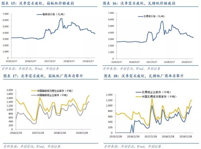 (四)箱板瓦楞紙廠庫存攀升,7月原紙價格持續疲軟 截至8月9日,箱板紙和瓦楞紙價格分別達到3860元/噸和3207.5元/噸,環比略有下降。需求疲弱導致箱板瓦楞紙庫存持續積累,紙價持續下跌;6月箱板廠商和社會庫存分別為140.8萬和171.7萬噸,環比分別上升6.34%和6.38%,同比分別上升47.6%和40.4%;瓦楞紙廠商和社會庫存分別為96.4萬和120.5萬噸,環比分別上升8.56%和8.46%,同比分別上升69.6%和59.0%。