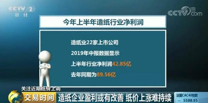記者梳理發現,今年以來,國內造紙廠已多次發布紙價調漲通知,僅山東晨鳴紙業一家已發出四次調漲函,然而實際落地效果一般。 專家表示,上半年調漲函多出于造紙商與下游經銷商的博弈,本輪漲價函與以往不同,因為需求的穩定和補庫存的需要,將會實現真正落地。 華創證券輕工行業首席分析師 郭慶龍:我們自己覺得有兩方面的原因,第一個方面是季節性原因,因為整個文化紙大類在三四季度會迎來非常明顯的旺季;第二個方面是微觀跟蹤下來,整個文化紙的紙價是在2018年一季度觸頂的,一直從2018年一季度調整到2019年二季度,經歷了大概一年半六個季度的調整。 后續走勢成謎:一方稱漲價將持續至春節前,一方稱漲價不可持續 從造紙廠調漲函發出到落地,下游市場往往會有兩到三周的反應時間。此次文化辦公用紙的大范圍調漲,將對造紙產業鏈帶來哪些影響,能否推動造紙及紙制品行業業績持續向好? 上海中華印刷有限公司作為國內最大的出版印刷企業之一,主要面向文化紙客戶,公司每年會采購2-3萬噸的原紙,采購供應部經理朱勇明告訴記者,這個月公司已接到漲價通知函,這次紙價調漲的落地預計將給公司在原材料端增加400-600萬的成本費用。