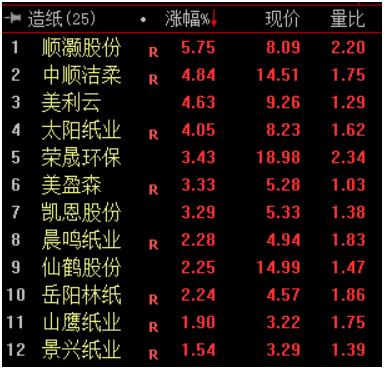 盤面上,造紙板塊今日逆勢(shì)飄紅。截至收盤,順灝股份漲5.75%,中順潔柔漲4.84%,太陽紙業(yè)、凱恩股份、晨鳴紙業(yè)、岳陽林紙等多股均漲幅不俗。