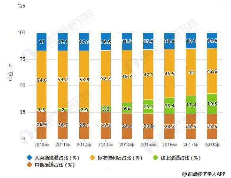 數據來源:前瞻產業研究院整理 從Euromonitor公布的數據來看,隨著線上流量越來越貴,線上部分的增速越來越慢,而其他部分則維持穩定。2018年中國生活用紙行業銷售渠道中大賣場占比14.6%,標準便利店占比為42.6%,較2010年下降了12個百分點。而大賣場渠道占比下降了2.4個百分點,由此看來,線上渠道的迅速增長主要是擠壓了標準便利店的渠道份額。另外根據生活紙巾的消費習慣來看,其屬于標準化、可存放時間長的必選消費品,在網上促銷是囤積一點也是正常合理的。 2010-2018年中國生活用紙行業銷售渠道占比統計情況