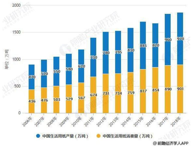 數據來源:前瞻產業研究院整理 中國生活用紙需求端表現穩健 生活用紙作為必選消費品,需求端表現穩健。2018年造紙行業整體需求疲軟,國內紙及紙板產銷分別同比下降6.2%、4.2%;但生活用紙仍然保持穩健增長,2018年產量為970萬噸,同比增長1%;消費量901萬噸,同比增長1.2%。 2006-2018年中國生活用紙產銷量統計情況
