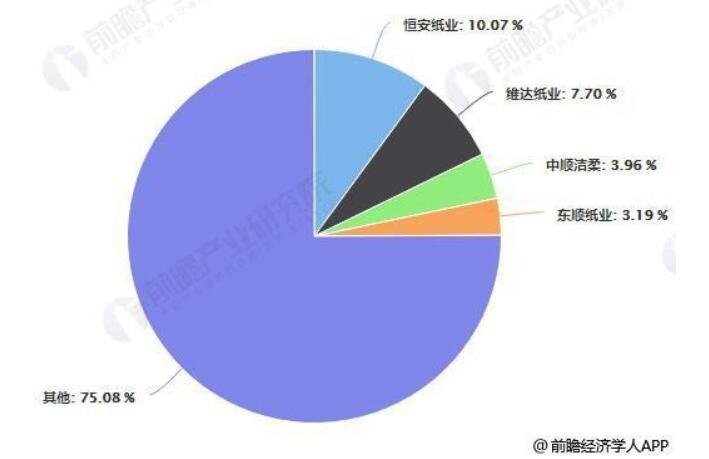 數據來源:前瞻產業研究院整理 中國生活用紙市場競爭激烈 生活用紙的市場競爭比較激烈,市場集中度相對較低,根據卓創資訊的統計,生活用紙行業產能較大的前52家企業的產能之和,也僅占生活用紙行業總產能的40.44%,行業內有大量的10萬噸以下的小產能。從產能口徑來看,行業產能前4的公司依次是恒安紙業、維達紙業、中順潔柔和東順紙業,除中順潔柔外,其他三家公司均未上市。 行業龍頭恒安紙業是恒安國際全資事業單位,從事生活用紙產品生產,擁有“心相印”、“安爾樂”等馳名商標,在重慶、湖南、山東等地建有造紙生產加工基地,年產能達到140萬噸以上。根據各公司2018年產能數據測算,生活用紙行業的CR4僅為24.65%,CR8和CR10也分別僅有30.45%和32.13%。 中國生活用紙市場競爭格局分析情況