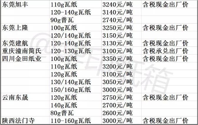 此外,小編整理發現,廣東、湖北、云南、湖南、還有7家紙廠漲價30-50元/噸。  10月8日主流紙廠瓦楞紙價格(數據來源:找包材)