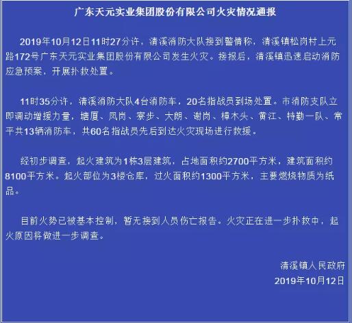 秋冬季節,天干物燥,火災事故極其容易發生!10月12日,廣東省東莞市清溪鎮松崗工業區一工廠發生火災,過火面積約1300平方米。據悉,起火工廠隸屬于廣東天元實業集團股份有限公司,該集團于今年5月份向證監會報送了招股書。 東莞一印刷廠發生重大火災 10月12日,業內人士的朋友圈幾乎被一場重大火災事故刷屏。據多個視頻顯示,廣東省東莞市清溪鎮一廠房著火,現場黑煙滾滾,多人在遠處圍觀。 根據官方通報,該工廠過火面積約為1300平方米,主要燃燒物質為紙品。12日11時35分許,清溪消防大隊出動4臺消防車,20名指戰員到場處置。隨后,東莞市消防支隊立即調動周邊地區13輛消防車,共60名指戰員進行救援。 廣東天元實業集團股份有限公司火災情況通報 2019年10月12日11時27分許,清溪消防大隊接到警情稱,清溪鎮松崗村上元路172號廣東天元實業集團股份有限公司發生火災。接報后,我鎮迅速啟動消防應急預案,開展撲救處置。 12日11時35分許,清溪消防大隊4臺消防車,20名指戰員到場處置。市消防支隊立即調動增援力量,塘廈、鳳崗、寮步、大朗、謝崗、樟木頭、黃江、特勤一隊、常平共13輛消防車,共60名指戰員先后到達火災現場進行救援。 經初步調查,起火建筑為1棟3層建筑,占地面積約2700平方米,建筑面積約8100平方米。起火部位為3樓倉庫,過火面積約1300平方米,主要燃燒物質為紙品。 目前火勢已被基本控制,暫無接到人員傷亡報告。火災正在進一步撲救中,起火原因將做進一步調查。