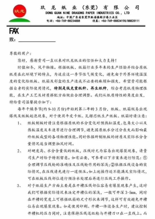 又到一年紙板爆線高發期!紙箱爆線最大的問題就是紙張的水分揮發,導致紙板干裂,一壓線就爆了。爆線不僅嚴重影響紙箱品質,造成廢品率急劇攀升,而且還會延遲交貨期,客戶投訴率也不斷上升,使企業蒙受經濟損失。 那么,紙板爆線就一定是紙板水分問題嗎?玖龍紙業根據紙板、紙箱行業多年來的生產經驗并結合原紙紙質在此環境下的特點,為各大紙板廠、彩盒廠給出了一則防爆指南,各位老板請收好! 一、良心干貨!玖龍紙業傳授紙板"防爆線"6大絕招 玖龍紙業傳授“防爆技巧”