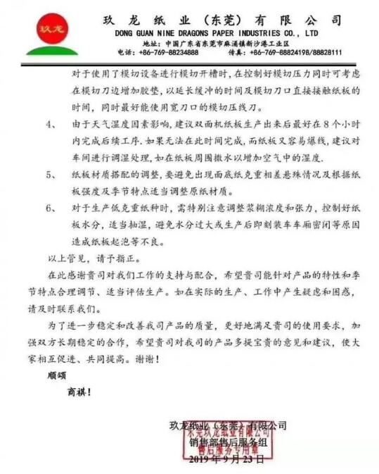 尊敬的用戶: 您好,感謝貴司一直以來對玖龍紙業的信任和大力支持! 時值初冬,風干物燥。根據紙板、紙箱行業多年來的生產經驗并結合原紙紙質在此環境下的特點,為適應這一季節性氣候變化,避免由于外界環境溫濕度的變化給紙板、紙箱及彩盒的生產造成不必要的麻煩和損失,希望貴司能根據自身的實際使用情況,特別是低克重紙種、再生紙種,綜合考慮紙質物理性能,在生產工藝及材質搭配方面做出合理調整。我們從紙質特性的角度出發,特給貴司溫馨提示如下: 每年干燥季節(約9-10月份)開始到第二年的3月份,紙板、紙箱極易出現爆線及紙板起泡現象,對于使用牛皮卡紙、瓦楞芯紙生產紙板、紙箱時請注意: 1、紙板制板時請注意根據原紙的水分變化對預熱缸溫度、包角大小以及熱板溫度及車速等進行合理調節,避免因原紙水分過分喪失而影響最終紙板成型的各項物理性能。同時依據所制紙板的材質及實際水分含量情況適當調整抽風時間。 2、對硬度高、水分含量低的紙板,壓線時尤為容易出現爆裂現象,請貴司生產時給予特別留意。如有必要,可參考以下方案來進行防范: ①合理調節壓線輪的準確性及壓線輪作用的深淺; 、谝罁䦃壕設備的實際情況,在壓線請先進行一道預壓。 如上述操作還不能滿足實際情況,可在紙板壓線部位進行預涂水處理后再進行壓線工序操作。 3、對于紙箱生產方面主要是在開槽壓線部位容易有爆裂現象產生,這時我們可根據實際情況來決定開槽位的深淺,一般可開深3-5mm,同時在開槽的寬度上可根據紙箱的尺寸形狀來調節,這樣可有效避免開槽位易出現爆裂現象。如是使用印刷、開槽一體設備生產時,建議控制開槽機的壓力同時,注意保持壓線送紙輪與開槽刀口在一直線上。而對于使用了模切設備進行模切開槽時,在控制好模切壓力同時可考慮在模切刀邊增加膠墊,以延長緩沖的時間及模切刀口直接接觸紙板的時間,同時最好能使用寬刀口的模切壓線刀。 4、由于天氣濕度因素影響,建議雙面機紙板生產出來后最好在8個小時內完成后續工序。如果無法在此時間完成,而紙板又容易爆線,建議對車間進行調濕處理,如在紙板周圍撒水以增加空氣中的濕度。 5、紙板材質搭配的調整,要避免出現面底紙克重相差懸殊情況及根據紙板強度及季節特點適當調整原紙材質。 6、對于生產低克重紙種時, 需特別注意調整漿糊濃度和張力,控制好紙板水分,適當抽濕,避免水分過大或生產后即刻裝車車廂密閉等原因造成紙板起泡等不良。 以上管見,請予指正。 在此感謝貴司對我們工作的支持與配合,希望貴司能針對產品的特性和季節特點合理調節、適當評估生產。如在實際的生產、工作中產生疑慮和困惑,請及時聯系我們。 為了進一步穩定和改善我司產品的質量,更好地滿足貴司的使用要求,加強雙方長期穩定的合作,希望貴司對我司的產品多提寶貴的意見和建議,使大家相互促進、共同提高。謝謝! 二、入秋紙板爆線高發期!"防爆"實用技巧,各位老板請收下! 此外,小編還為大家整理了技術專家團隊此前分享的一些“防爆”實用技巧,希望對大家有所幫助。 1、印刷機壓線爆線 一般情況下,低克重、低等級材質的紙板,在冬季爆線的幾率是非常大的。但是,現在很多紙箱廠使用的都是高等級的紙板,如果還出現爆線,那我們就要考慮一下紙箱壓線的問題了。 印刷的壓線分為預壓和正式壓線,預壓輪主要起到粉碎瓦楞的作用,把瓦楞壓潰后,使之更有利于紙箱壓線成型。壓線輪的正確調整及設備改進可以減少爆線的發生。 壓線的不同種類: