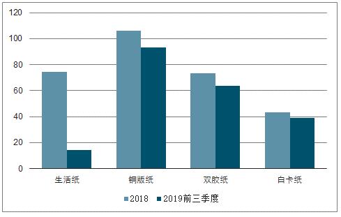 數(shù)據(jù)來(lái)源:公開資料整理 2018-2019前三季度生活紙、銅板紙、雙膠紙、白卡紙開工率