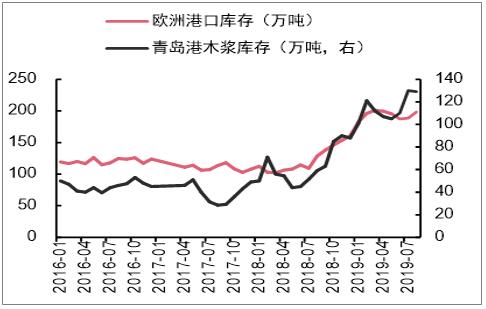 數(shù)據(jù)來(lái)源:公開資料整理 2019年截至目前,木漿均價(jià)跌幅已接近25%。需求不振、港口庫(kù)存依然高企疊加人民幣短期貶值壓力,然而長(zhǎng)期來(lái)看,木漿供給格局較為集中,全球Top5木漿廠產(chǎn)能占比約36%,而Top5闊葉漿廠產(chǎn)能占比超50%。19H2以來(lái)海外漿廠已通過停機(jī)減產(chǎn)以及減少發(fā)運(yùn)量的方式維持漿價(jià)穩(wěn)定,在上游持續(xù)去庫(kù)存期間,預(yù)計(jì)至2021年前全球漿廠將不再投放新增產(chǎn)能。在上游控量保價(jià)的大背景下,漿價(jià)下行空間有限,預(yù)計(jì)2020年有望企穩(wěn)。而漿價(jià)反彈則取決于下游需求的修復(fù)程度,對(duì)此我們?nèi)詴?huì)持續(xù)跟蹤。 全球港口木漿庫(kù)存水平依然高企