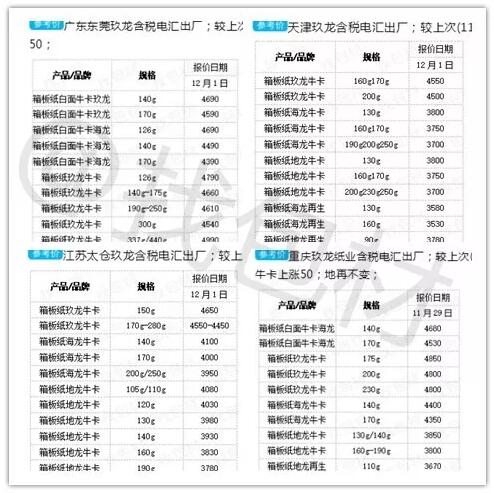 1、玖龍、理文、山鷹三巨頭再次集體漲價,掀起12月“漲價潮” 東莞玖龍:12月1日起,在11月21日的基礎上,玖牛漲100元/噸,海牛漲50元/噸,地牛漲50元/噸,瓦紙48-70g漲50元/噸,其它價格不變。 太倉玖龍:12月1日起,所有紙種上調50元/噸。 天津玖龍:12月1日起,所有再生紙、海龍高瓦、地龍高瓦、地龍牛卡上調50元/噸,其它紙種價格維持不變。 重慶玖龍:地龍灰底白、江龍灰底白、海龍灰底白上漲50元/噸。