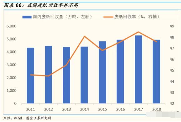 廢紙進口量銳減,我國的廢紙回收率不高,導致原材料持續收緊,這將觸發包裝紙價格走強。 應對廢紙缺口的三種途徑 應對外廢禁令下的廢紙缺口,主要有三種解決途徑: 1)直接進口成品紙:2018年,國內進口瓦楞紙和箱板紙數量分別為 111.12萬噸和135.39萬噸,同比增長71.32%和51.03%。原紙進口增長雖快,但絕對體量相對較小,與全國每年近5000萬噸的包裝紙需求相比,進口包裝紙原紙短期內較難形成補償。