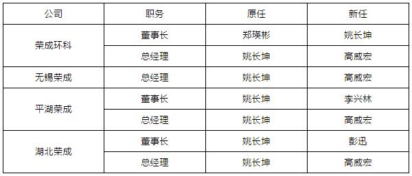 另代重要子公司湖北榮成公告,董事長(zhǎng)、總經(jīng)理由姚長(zhǎng)坤分別換上彭迅、高威宏,董事也從鄭國(guó)泰換上彭迅;以及代重要子公司無(wú)錫榮成公告,總經(jīng)理由姚長(zhǎng)坤換上高威宏。