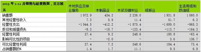 2019年1-12月(與2018年1-12月相比) 銷售額為54.73億歐元(去年同期:57.09億歐元)。 經營性利潤為3.74億歐元(去年同期:8.43億歐元)?杀冉洜I性利潤為4.95億歐元(去年同期:8.49億歐元)。 稅前利潤為3.16億歐元(去年同期:7.69億歐元)。可比稅前利潤為4.36億歐元(去年同期:7.75億歐元)。 可比已占用資本回報率為9.6%(去年同期:16.8%)。 經營現金流為6.58億歐元(去年同期:8.82億歐元)。 2019年10-12月(與2018年10-12月相比) 銷售額為12.90億歐元(去年同期:14.19億歐元)。 經營性利潤為3200萬歐元(去年同期:2.08億歐元)?杀冉洜I性利潤為7600萬歐元(去年同期:2.08億歐元)。 稅前利潤為1800萬歐元(去年同期:1.93億歐元)。可比稅前利潤為6200萬歐元(去年同期:1.93億歐元)。 可比已占用資本回報率為6.1%(去年同期:16.4%)。 經營現金流為2.36億歐元(去年同期:2.92億歐元)。 2019年第四季度主要事件 與上一季度相比,以美元計價的長纖與短纖漿平均價格分別下降了10%和15%。 由于12月份的季節性下降,紙板的交付量比上一季度有所減少。折疊紙板與白牛卡的平均價格保持穩定。 芬林紙板開始對胡蘇姆紙漿廠第一階段現代化進行投資,為最終投資決定做準備,投資額為2100萬歐元。第一階段投資總額約為3.2億歐元。 2019年12月,芬林生活用紙就出售餐巾業務達成協議。此項交易涉及德國Stotzheim工廠的物業、機械、設備和倉庫,以及Fasana和Mondial品牌。 在報告期后發生的事件 由于芬蘭造紙工人工會與工業工會的罷工,芬林集團所有芬蘭工廠的生產于2020年1月27日停滯,造紙工人工會在制漿造紙行業的罷工持續至2020年2月10日。木制品行業工人工會的罷工仍在繼續。 2020年1-3月利潤預測 由于芬蘭工廠的罷工,2020年第一季度可比經營性利潤預計將比2019年第四季度有所下降。 芬林集團總裁兼首席執行官何亦凱(IlkkaHämälä)表示: “從2018年第四季度起,紙漿價格開始下降,并一直持續至整個2019年,這導致芬林集團的業績水平與2018年相比出現顯著下降。木制品(如鋸材、膠合板與單板層積材)的需求和價格同樣很低。集團折疊紙板與白牛卡業務保持良好水平,符合預期。生活用紙與防油紙市場具有典型的穩定性,業務的運營效率則受益于芬林生活用紙的戰略調整而得到了提高。 那些推動所有產品長期需求與增長的因素預計不會發生改變。消費者需求預計將增長,特別是在發展中市場。此外,在所有市場領域中,可再生材料(如木材)制成的產品有望進一步替代化石基材料。在從森林到消費者這一整條價值鏈的發展中,生態可持續性的進一步改善將變得越來越重要。 芬林集團的運營始于森林管理。我們是波羅的海地區最大的森林管理服務供應商。在業務發展過程中,我們始終致力于降低氣候變化對林業的影響,促進森林本身的生物多樣性。同時,我們努力確保林業的財務可持續性,這對私人森林所有者、相關企業與芬蘭社會都非常重要。除了在森林中開展的工作外,想要確保財務、社會及生態的可持續性,還需要持續發展我們的工廠、產品以及相關的整條價值鏈。 在過去幾年里,芬林集團已向北歐木材加工廠投資超過20億歐元。目前,我們正計劃下一個約20億歐元的投資計劃。胡蘇姆木漿廠回收鍋爐的投資準備工作正在進行中。即將在凱米(Kemi)興建的生物制品工廠正在申請環境許可,有關投資決策的其他準備工作也在進行中。勞馬新一代鋸木廠的前期工程項目也正在按計劃進行。” 關鍵數據