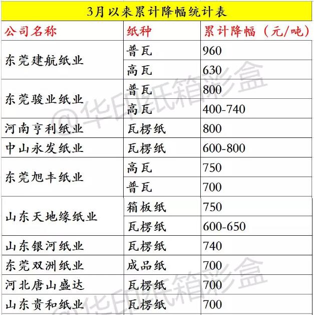 據華印小編不完全統計,3月1日-16日期間累計降幅在500元/噸以上的紙廠就有18家。其中,東莞建航紙業普通瓦楞紙累計降幅已高達近1000元/噸。具體如下表所示: