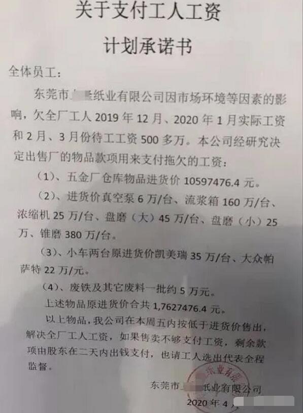 關于支付工人工資計劃承諾書 東莞市某紙業有限公司因市場環境等因素,欠全廠工人2019年12月、2020年1月實際工資和2月、3月份待工工資共500多萬。經研究決定,公司出售廠的物品款項用來支付拖欠的工資: 1、五金廠倉庫物品進貨價10597476.4元。 2、真空泵6萬/臺、流漿箱160萬/臺、濃縮機25萬/臺、盤磨(大)45萬/臺、盤磨(小)25/臺、錐磨380萬/臺。 3、小車兩臺,原進貨價,凱美瑞35萬元、大眾帕薩特22萬元。 4、廢鐵及其他廢料一批約5萬元。 上述物品原進貨價合計17627476.4元。 以上物品,我公司在本周五內按低于進貨價售出,解決全廠工人工資,如果售賣不夠支付工資,剩余款項由股東在兩天內出錢支付,同時請工人選出代表全程監督。 據了解,該紙廠產品為瓦楞紙,年產能在50萬噸左右,算是一家較有規模的企業。但即便如此,在當下的市場環境下,該紙廠也面臨經營危機。從承諾書來看,該紙廠的做法還算體面,希望能在短時間內解決員工的工資問題。 近兩年來,貿易戰、環保風暴、原材料價格波動等因素壓得企業喘不過氣,復雜多變的經營環境令紙品包裝產業鏈上下游企業困難重重。而該紙廠的情況,正是眾多中小企業在此背景下的真實反映。以前不少,以后也不會少。